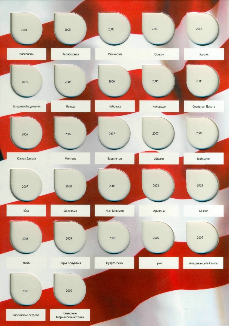 Коллекционный альбом, для размещения 60-ти памятных монет, номиналом 25 центов (квотеров) США выпущенных в период с 1999 по 2009 годы, из серии "Штаты и территории США".