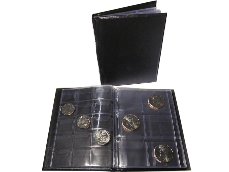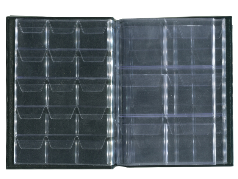 Имеет 8 листов: 4 листа по 15 ячеек 30х28 мм с клапанами на листе (квотер США) и 4 листа по 6 ячеек 48х48 мм с клапанами.