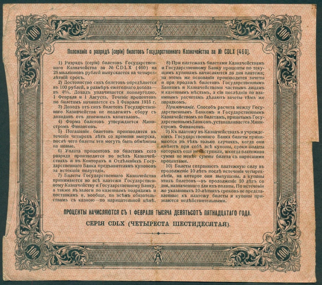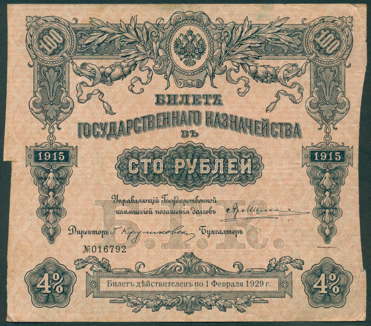 Российская Империя, 100 рублей 1915 год Билет Государственного Казначейства.