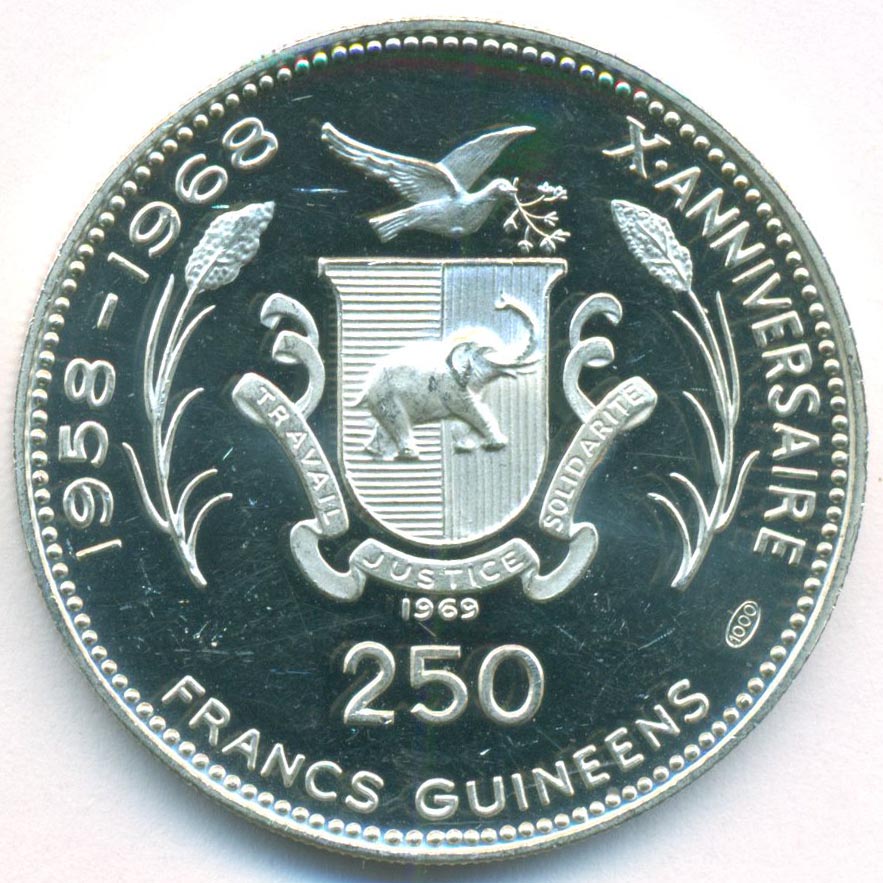 Юбилейная монета, приуроченная к 10-й годовщине провозглашения независимости Гвинеи от Франции.
