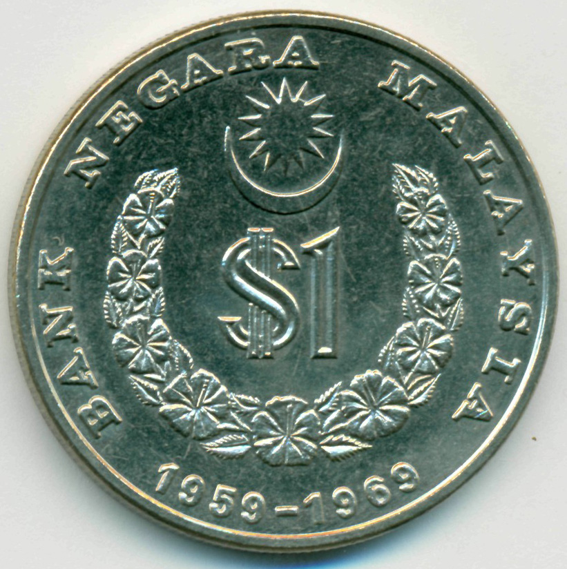 Памятная монета, приуроченная к 10-й годовщине со дня основания Центрального банка Малайзии.