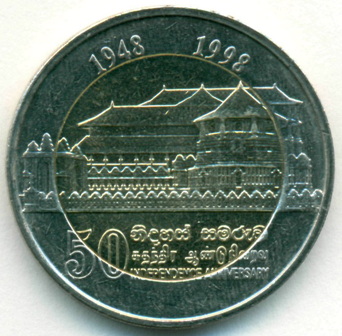 Юбилейная монета, посвященная 50-й годовщине провозглашения независимости Шри-Ланки от Великобритании, 4 февраля 1948 года.