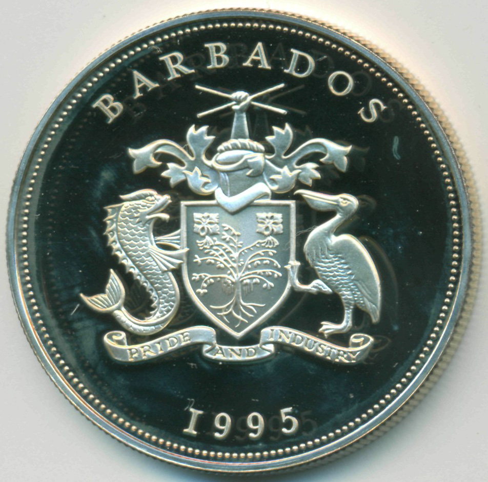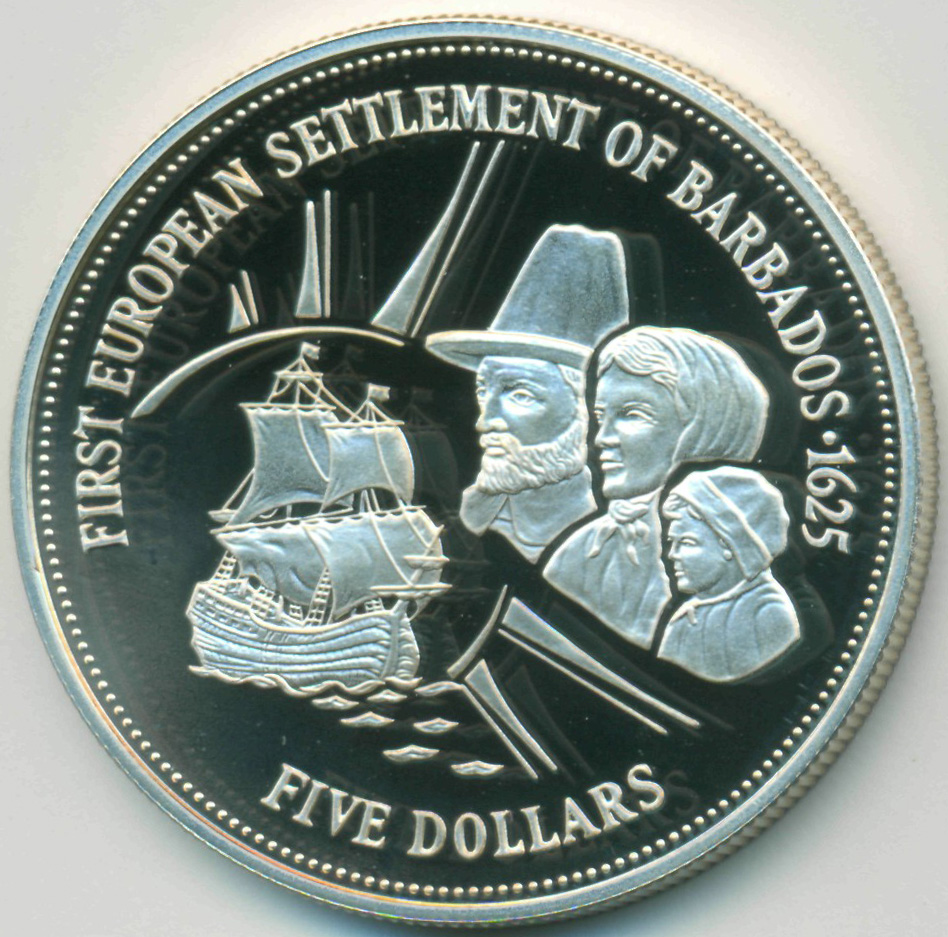 Памятная монета, приуроченная к 370-летию образования первого поселения европейцев на острове Барбадос, 1625 год.