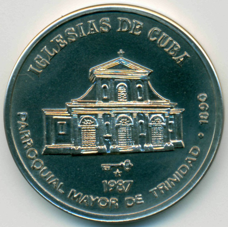 Памятная монета, из серии "Церкви Кубы". Церковь Святой Троицы в городе Тринидад (Куба), основанная в 1890 году.