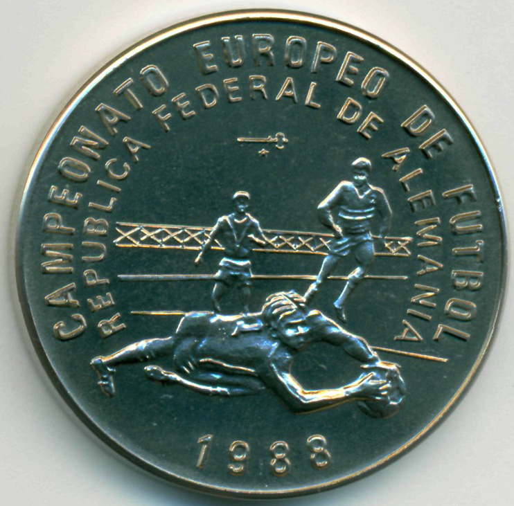 Памятная монета, приуроченная к проведению VIII Чемпионата Европы по футболу в ФРГ, 1988 год.