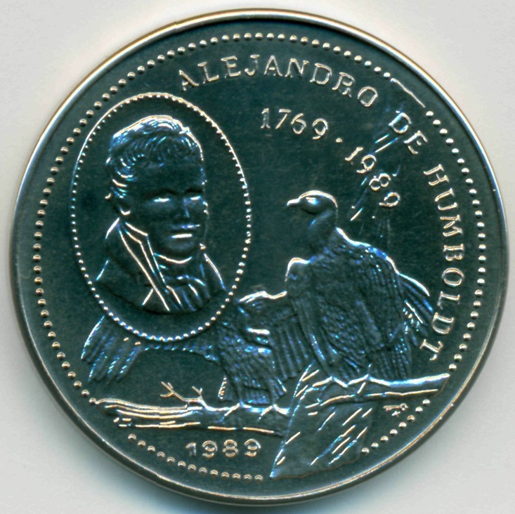 Памятная монета, приуроченная к 220-й годовщине со дня рождения Александра фон Гумбольдта (1769-1859) - немецкого ученого-энциклопедиста, совершившего "второе открытие Америки", 1799 - 1804 годы.