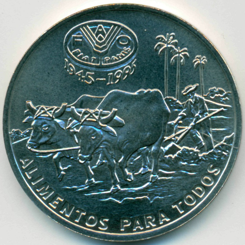 Памятная монета, приуроченная к 50-й годовщине со дня основания "Продовольственной и сельскохозяйственной организации (F.A.O.)" под игидой ООН, 16 октября 1945 год.