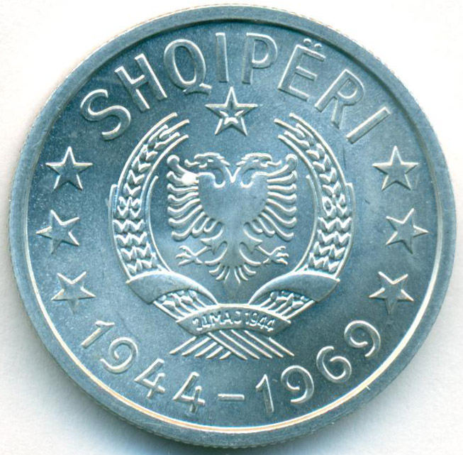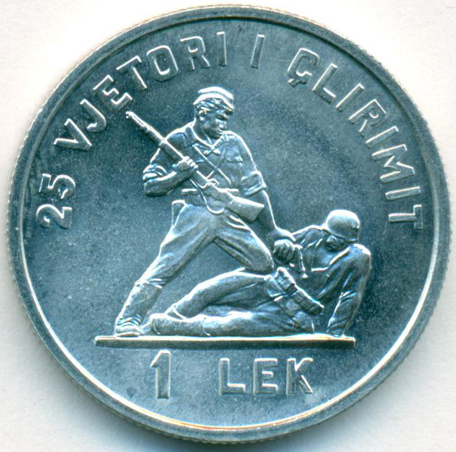 Памятная монета, приуроченная к 25-й годовщине освобождения Албании от фашизма.