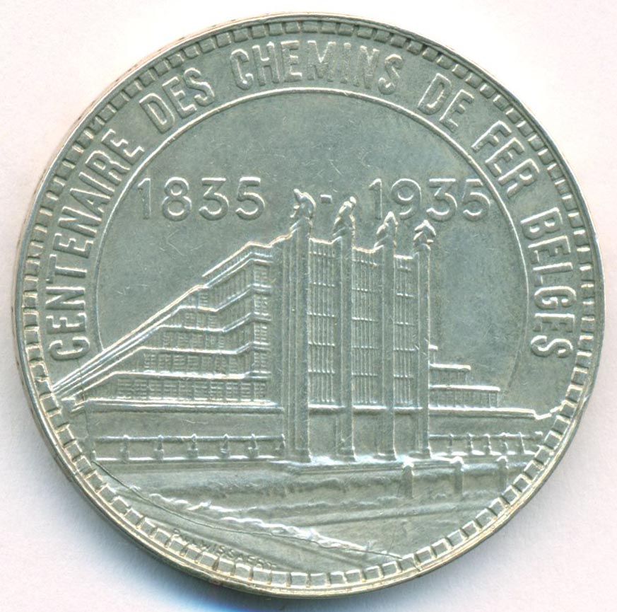 Памятная монета, приуроченная к 100-летию открытия первой железной дороги Бельгии, между городами Брюссель и Мехелен 1835 году.