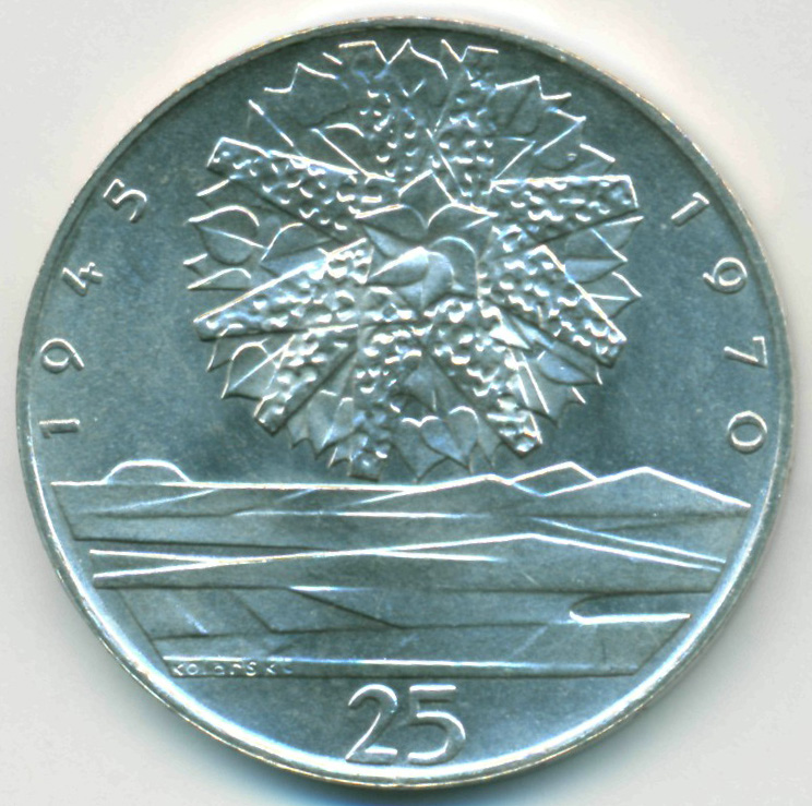 Памятная монета, посвященная 25-й годовщине освобождения Чехословакии от немецкой окуппации.