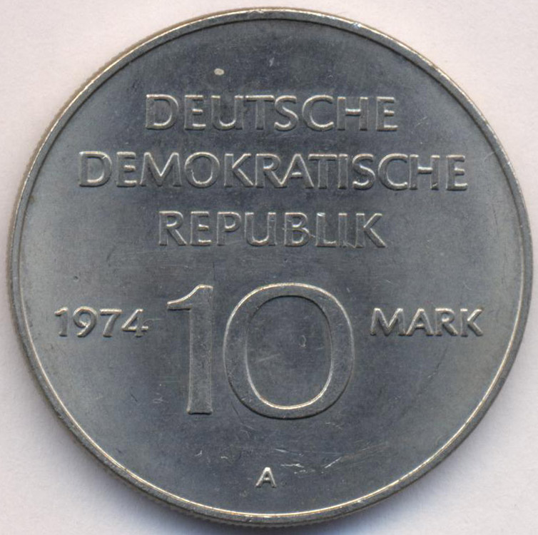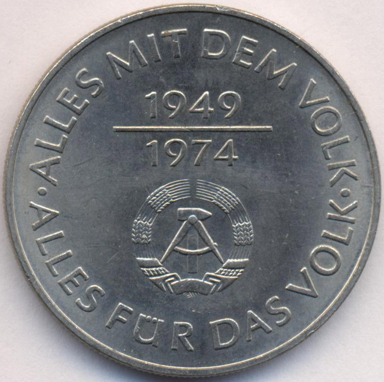 Юбилейная монета, посвященная 25-й годовщине образования Германской Демократической Республики.
