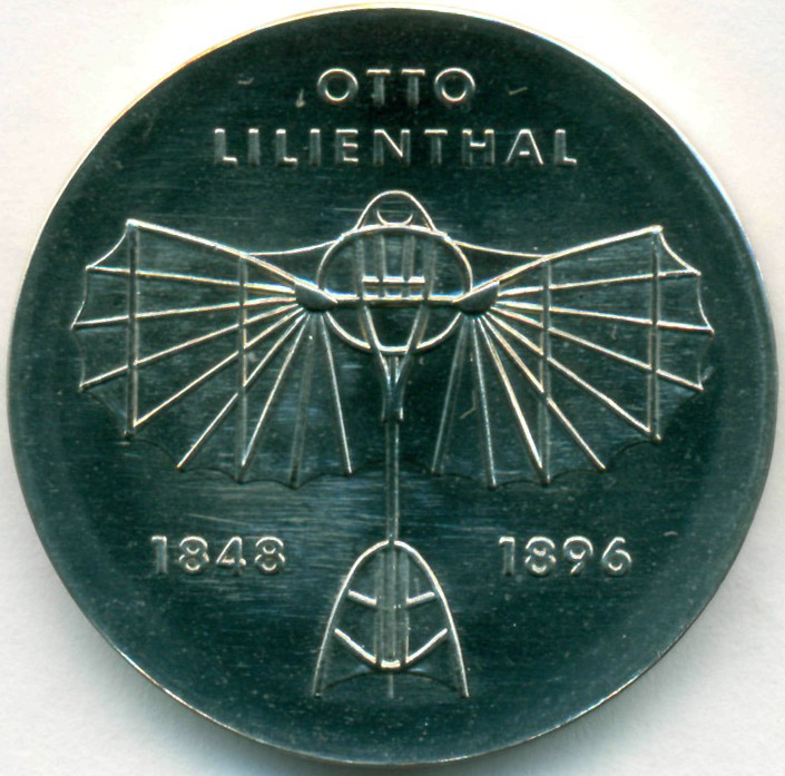 Памятная монета, посвященная 125-й годовщине со дня рождения Отто Лилиенталя (1848-1896) - немецкого инженера.