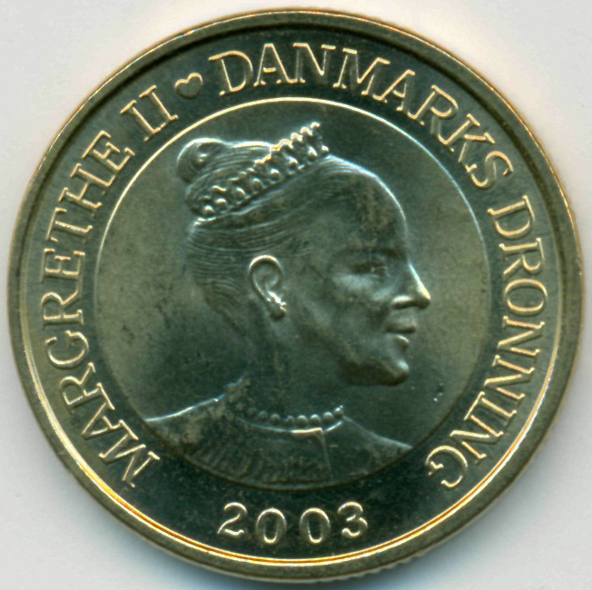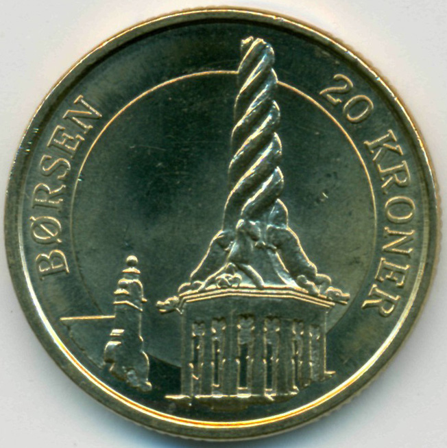 Памятная монета, из серии "Архитектура Дании". Башня фондовой биржи Борсен в Копенгагене.