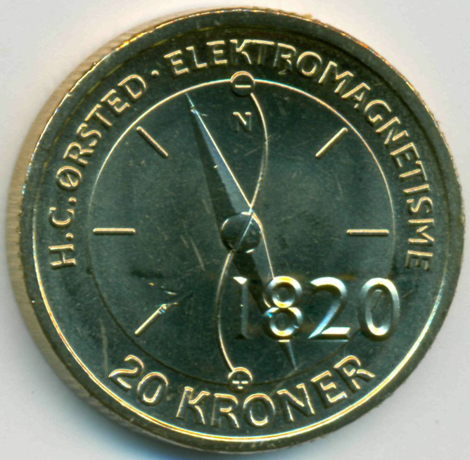 Памятная монета из серии "Выдающиеся ученые Дании". Ханс Кристиан Эрстед (1777-1851) - датский ученый-физик, создавший теоретическое обоснование существования электромагнитных волн в 1820 году.
