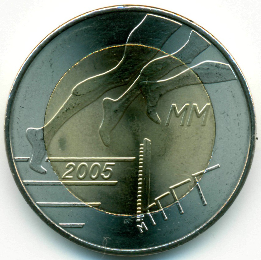 Памятная монета, приуроченная к проведению X Чемпионата Мира по легкой атлетике в Хельсинки (Финляндия), 2005 год.