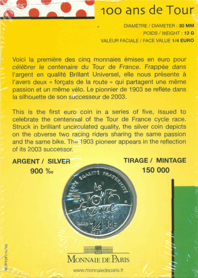Памятная монета, приуроченная к 100-летию проведения велогонки Тур-де-Франс - самой престижной велогонки мира, проводимой во Франции.