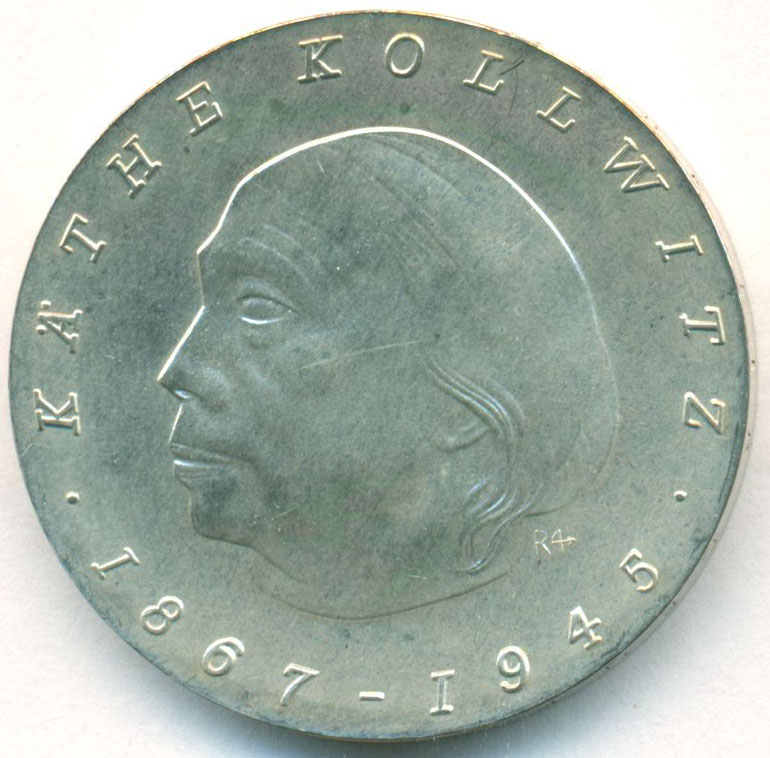 Юбилейная монета, посвященная 100-й годовщине со дня рождения Кете Кольвиц - немецкой художницы, графика и скульптора.