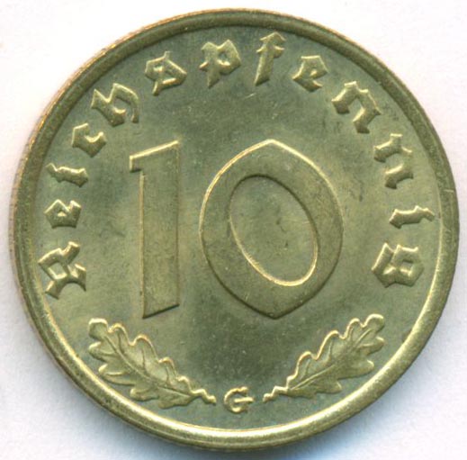 Третий рейх, 10 рейхспфеннигов 1939 год G (UNC)