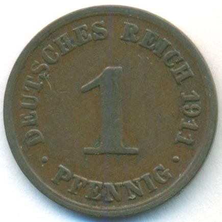 Германия, 1 пфенниг 1911 год A