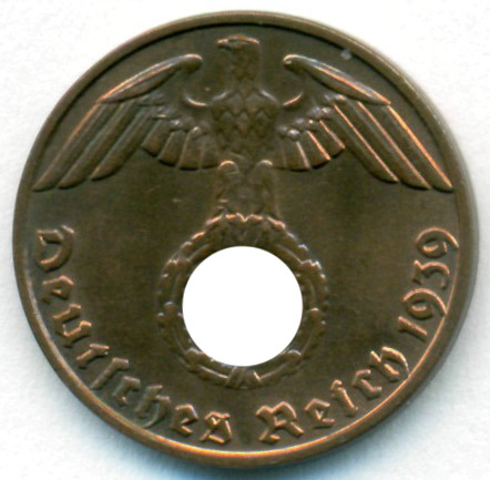 Третий рейх, 1 рейхспфенниг 1939 год B (UNC)