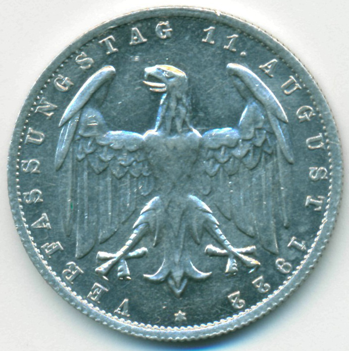 Выпуск монеты приурочен к 3-й годовщине со дня подписания Конституции Веймарской республики, рейхспрезидентом Фридрихом Эбертом, 11 августа 1919 годa.