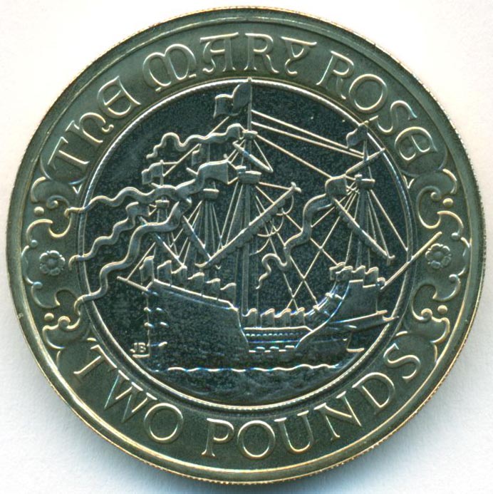 Памятная монета, посвященная 500-й годовщине спуска на воду английской трехпалубной каракки "Мэри Роуз" - флагмана Английского военного флота при короле Генрихе VI Тюдоре.