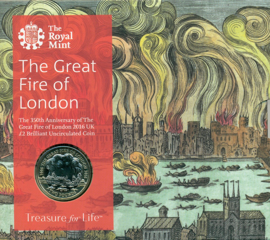 Памятная монета, посвященная 350-летию Великому Лондонскому пожару 1666 года.