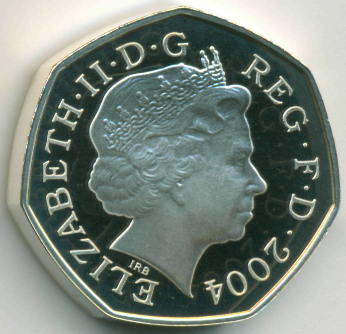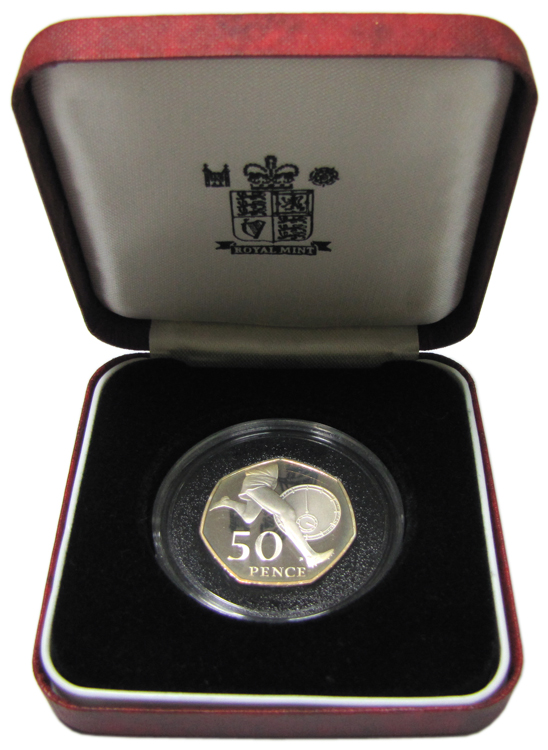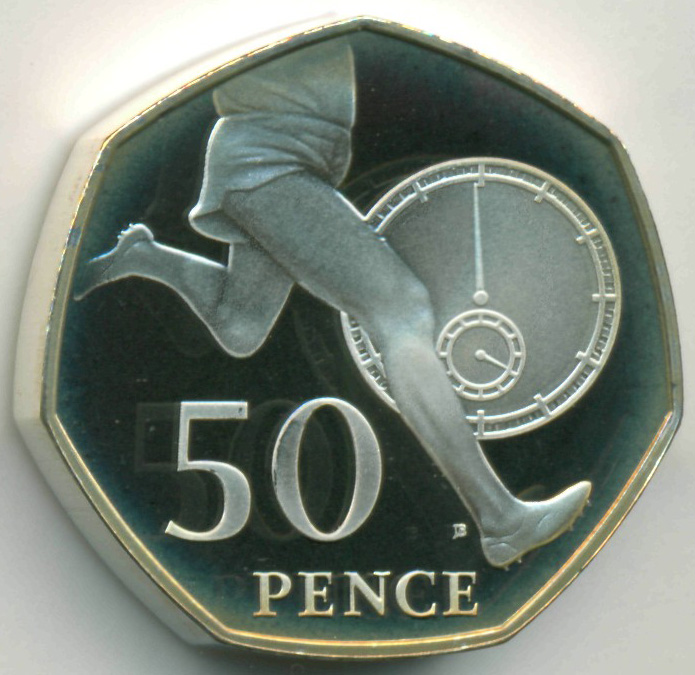 Памятная монета, посвященная рекорду Мира в беге на 1 милю среди мужчин, установленному Роджером Баннстером 6 мая 1954 года, пробежавшем дистанцию менее чем за 4 минуты - 3.59,4.