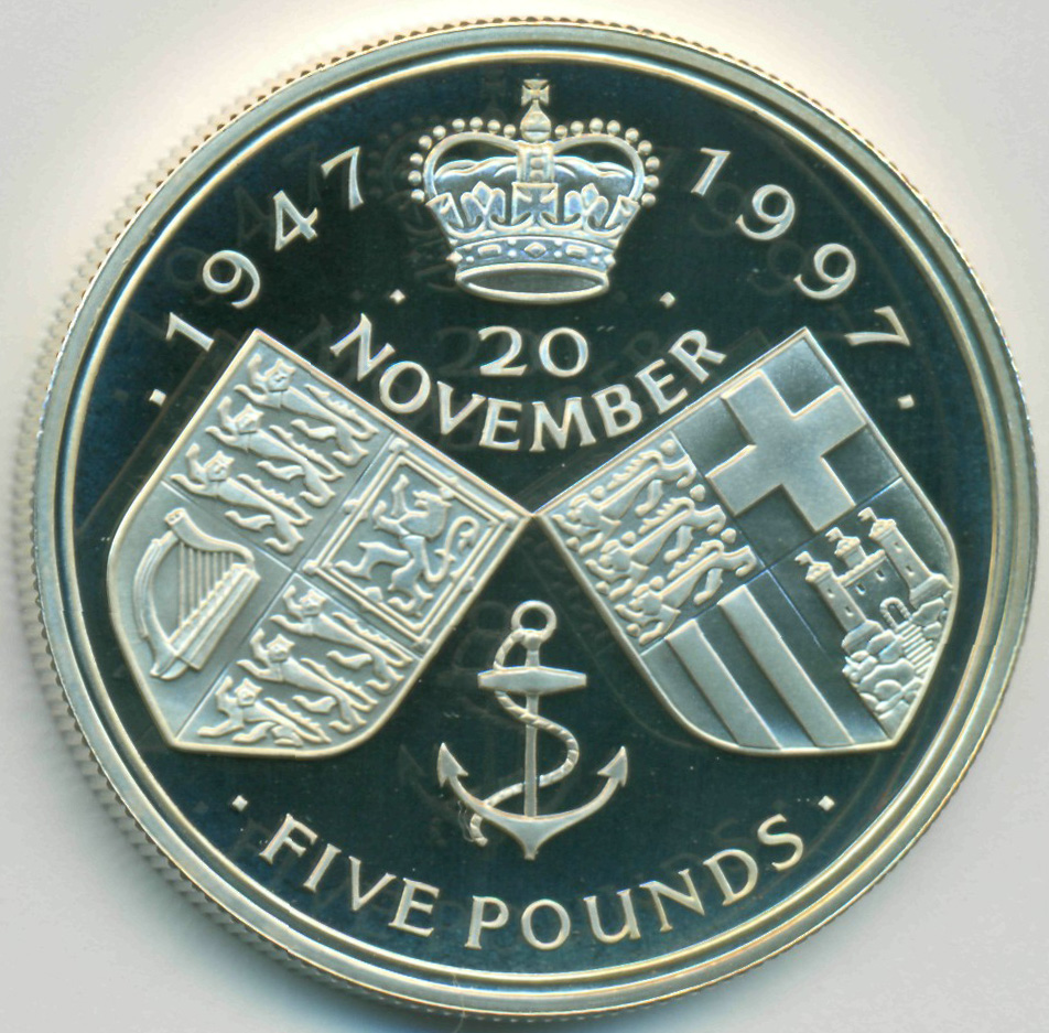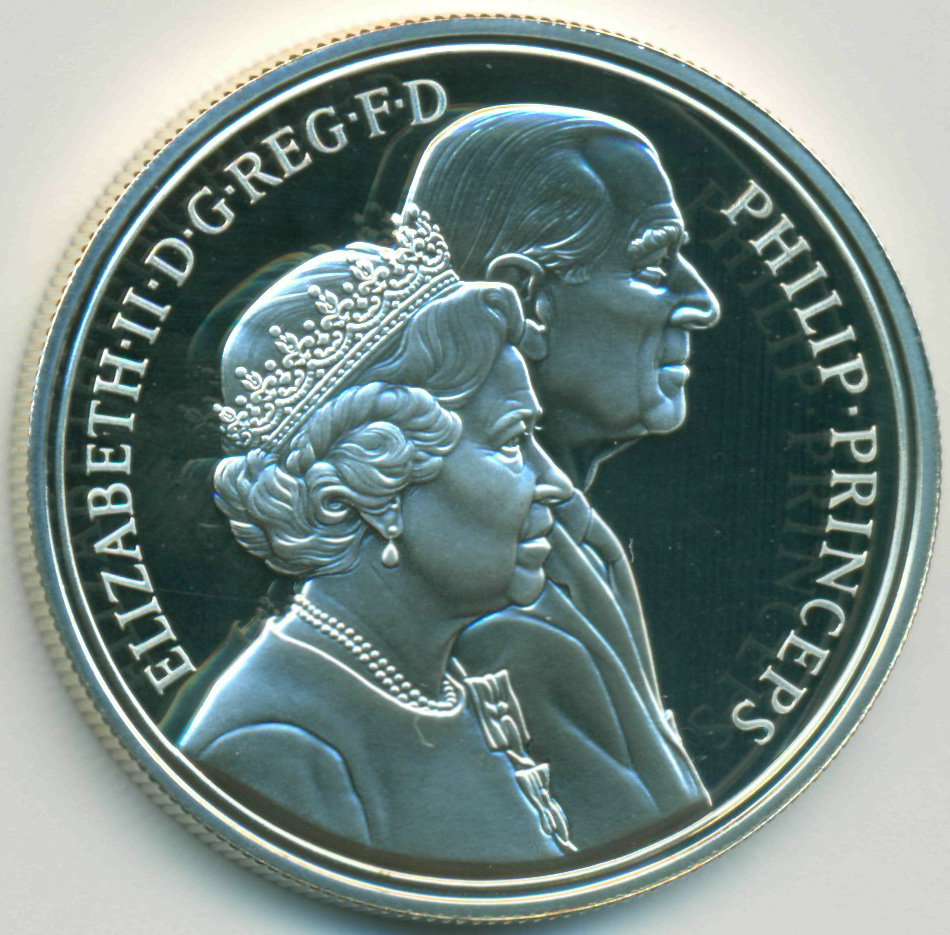 Памятная монета, приуроченная к 50-й годовщине со дня бракосочетания королевы Великобритании Елизаветы II и принца Филиппа.