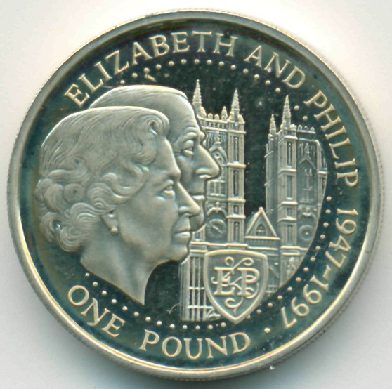 Памятная монета, посвященная 50-й годовщине со дня бракосочетания Королевы Великобритании Елизаветы II и Принца Филиппа.