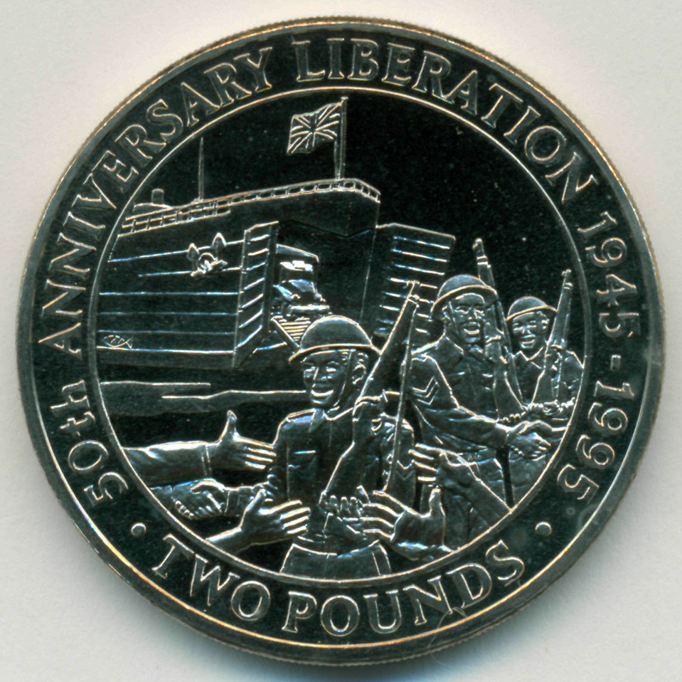 Юбилейная монета, посвященная 50-ой годовщине освобождения Гернси от фашизма.