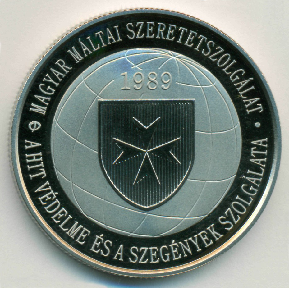 Юбилейная монета, посвященная 25-й годовщине основания Венгерской Благотворительной службы Мальтийского ордена.