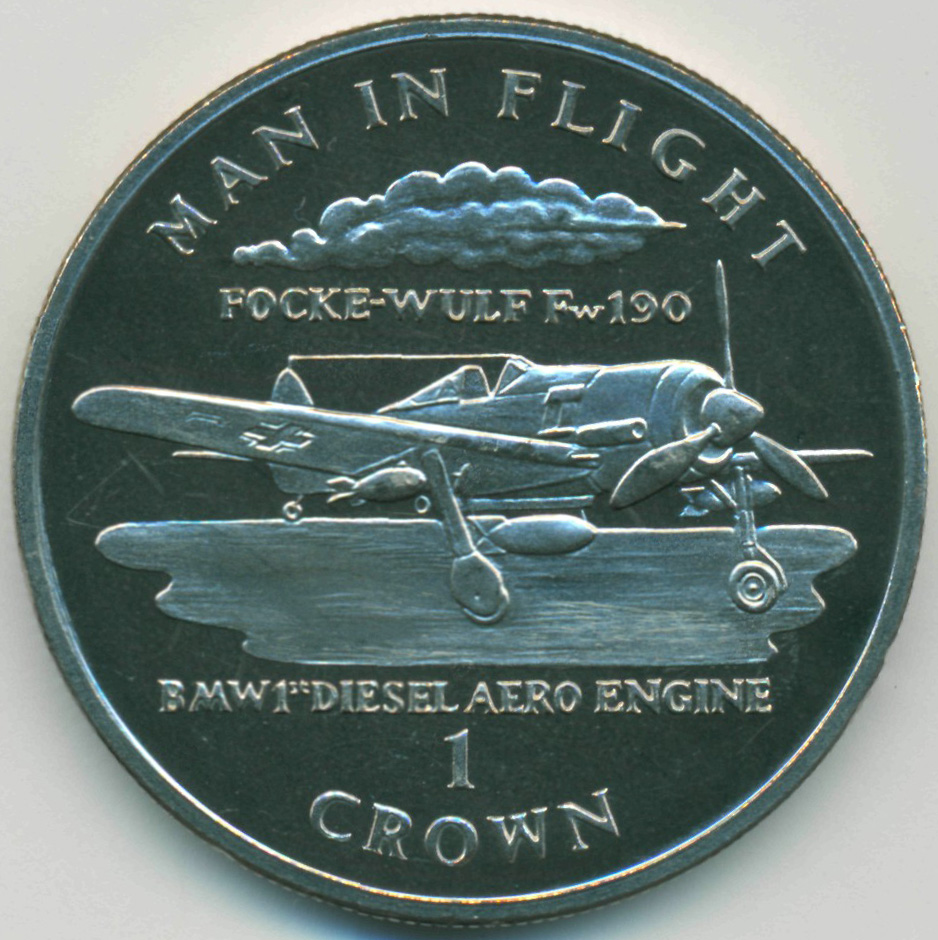 Коллекционная монета из серии "История самолетостроения (человек в полете)". Фокке Вульф FW-190 - немецкий одноместный одномоторный истребитель-моноплан, с дизельным аэродвигателем BMW-1.