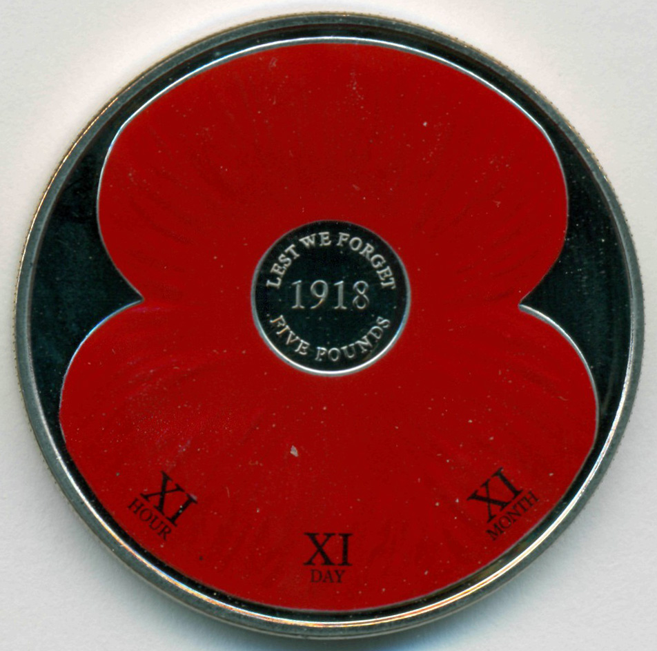 Памятная монета, приуроченная к чествованию в Великобртании Дня Памяти погибших в войнах. Ежегодно 11 числа 11 месяца (наября) в 11-00 часов утра, проходит минута молчания (официальная дата окончания Первой Мировой войны в 1918 году).