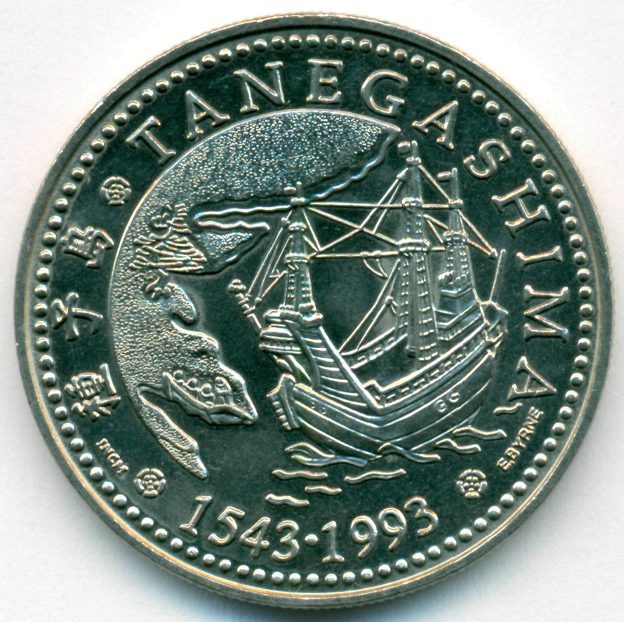 Памятная монета, посвященная 450-летию первой высадки португальской экспедиции в Японии, на острове Танегасима.