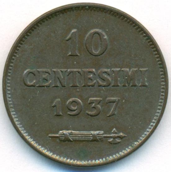 Сан-Марино, 10 чентезимо 1937 год (AU)