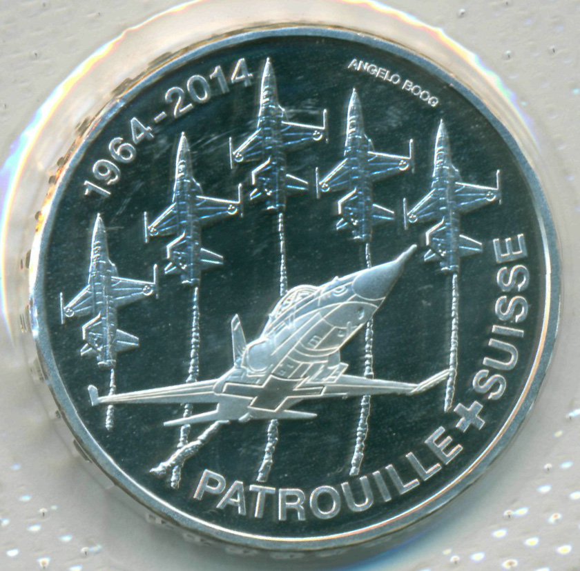 Юбилейная монета, посвященная 50-й годовщине создания пилотажной группы ВВС Швейцарии "Патруль Сюисс".