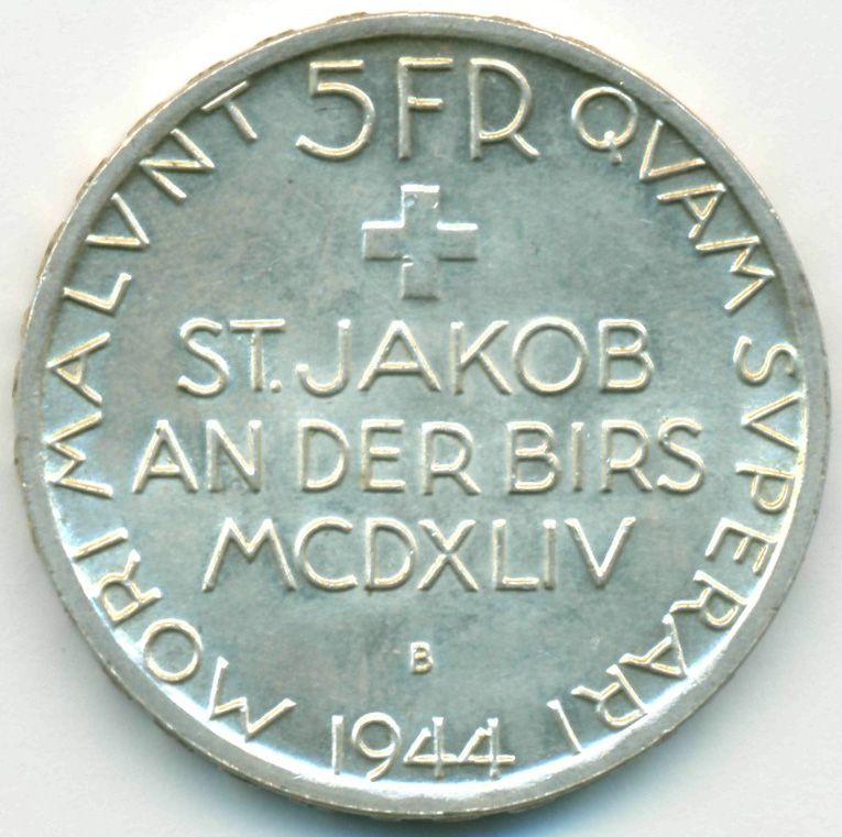 Памятная монета, приуроченная к 500-й годовщине со дня битвы при Санкт-Якобе у Бирса (26.08.1444) - сражение Старой Цюрихской войны.