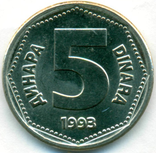 Югославия, 5 динаров 1993 год (UNC)
