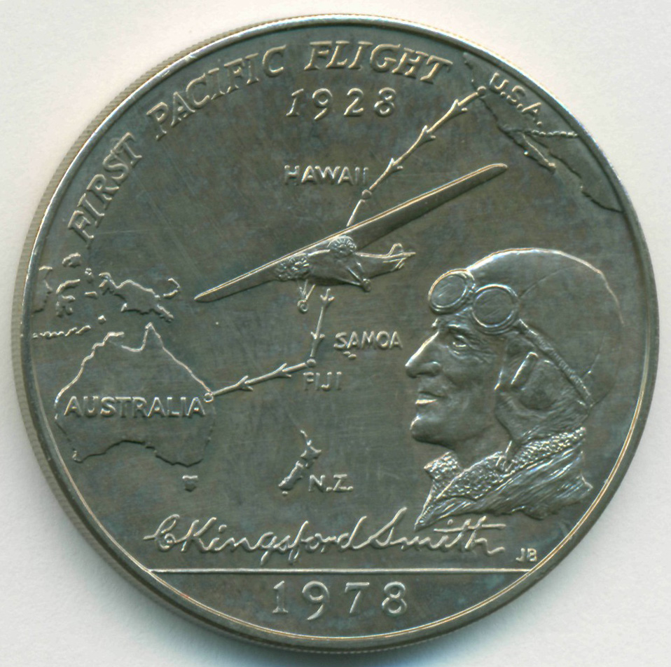 Памятная монета, приуроченная к 50-й годовщине первому беспосадочному полету через Тихий океан, совершенному Кингсфордом Смитом в 1928 году.