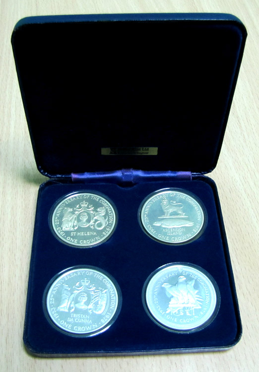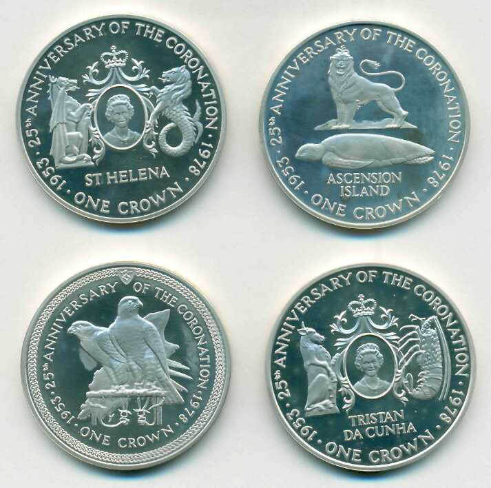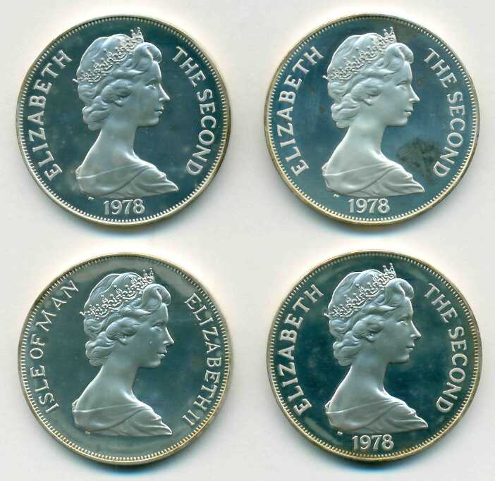 Набор из 4-х серебряных однокроновых монет 1978 года, посвященный 25-летию коронации королевы Великобритании Елизаветы II.